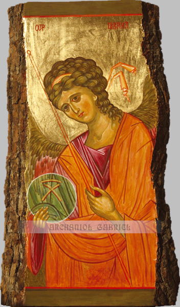 Archanioł przedstawiony jest w półpostaci. W jednym ręku trzyma laskę posłańca w drugim kulę świata,