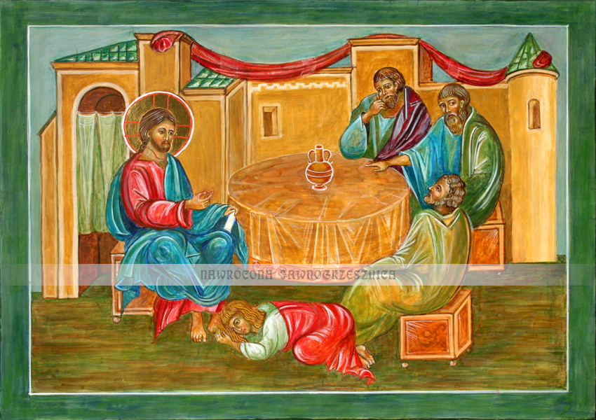 Nawrócona jawnogrzesznica 42×30 cm Jest to scena opisana u Św. Łukasza 7, 36-50. Przedstawia Chrystusa oraz kobietę całującą Jego nogi i ocierającą je włosami. Naprzeciwko Chrystusa za stołem zasiada trzech faryzeuszy. Wydarzenie to miało miejsce w domu Szymona faryzeusza gdzie Chrystus został zaproszony na posiłek. Czerwona szarfa rozciągnięta na widocznych z tyłu budowlach wskazuje, że scena ta odbywa się we wnętrzu. Kobieta określana jako jawnogrzesznica w niecodzienny sposób wyraża swoją miłość i uwielbienie dla Chrystusa. Ikona wykonana na desce lipowej; malowana temperą jajeczną, złocona. |