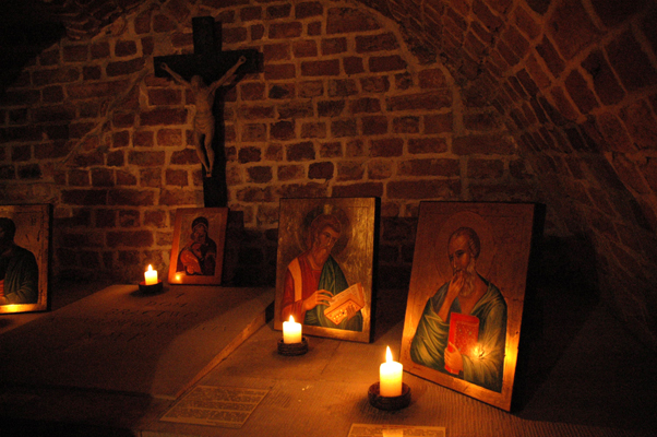 Wniebowzięcia Najświętszej Maryi Panny. Zdjęcia ikon zostały umieszczone na zabytkowym kamiennym murze
